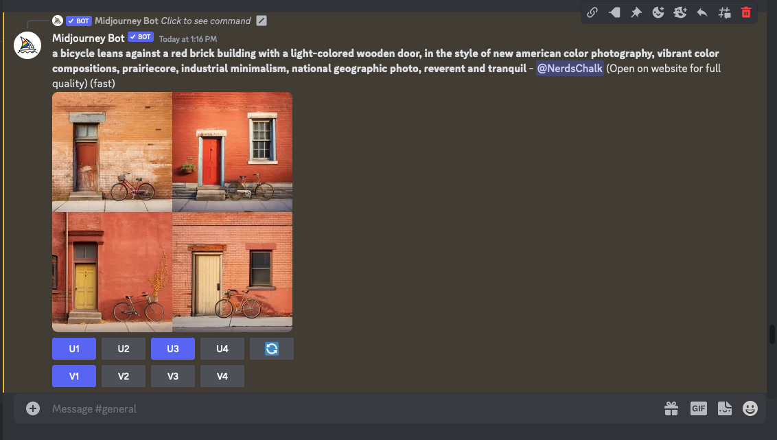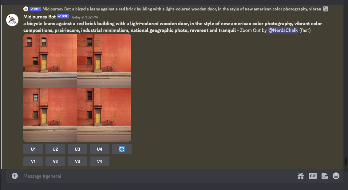 Once you’ve recreated an existing image inside Midjourney using the Describe tool, you can use the Zoom Out feature to outpaint the image you generated on the AI tool. For this, you need to upscale the image that you like from the results generated using the Describe command. To upscale one of the images from the previous output, click on any of the options between U1 and U4 corresponding to the image that you want to outpaint.