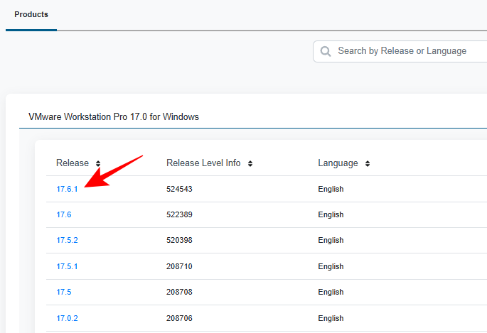 Step 9: Select the VMware Workstation Pro version you want to download.