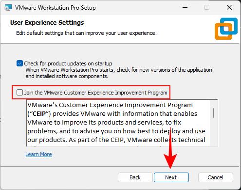 Step 4: Uncheck Join the VMware Customer Experience Improvement Program. Then click Next.