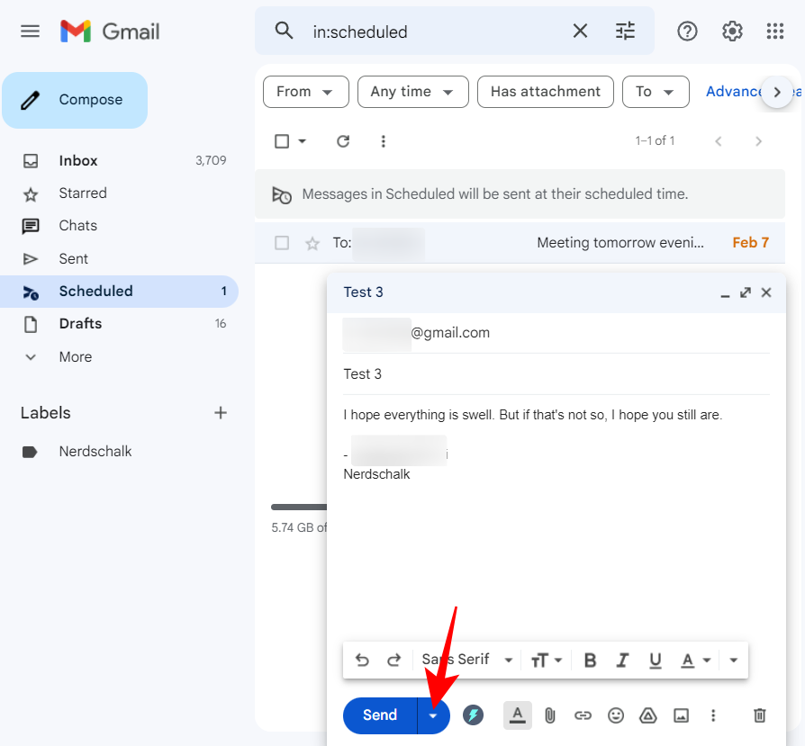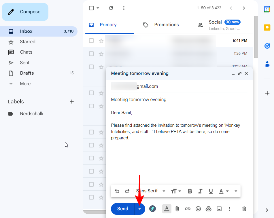 Compose your email as you would normally, with the subject matter, the content, as well as the recipient’s email address. Then, instead of clicking on the “Send” button, click on the downward-facing arrow next to it.