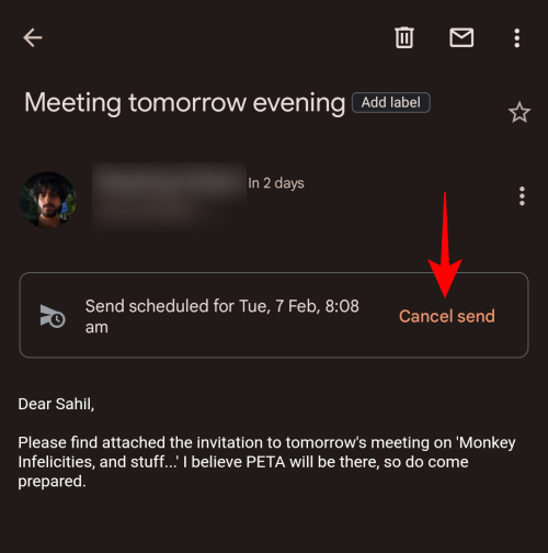 The process to editing a scheduled email in Gmail on an iPhone is the same as on Android, that is – Select the “Scheduled” folder in the left pane, select your scheduled email, click on “Cancel send”, and then edit the draft as you like. Lastly, enter the new time and date when you want the email to be scheduled and click on “Schedule send”.