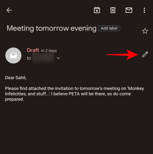 This will cancel the scheduled email and transfer it to the “Drafts” folder for editing. Click on the pencil icon to start editing.