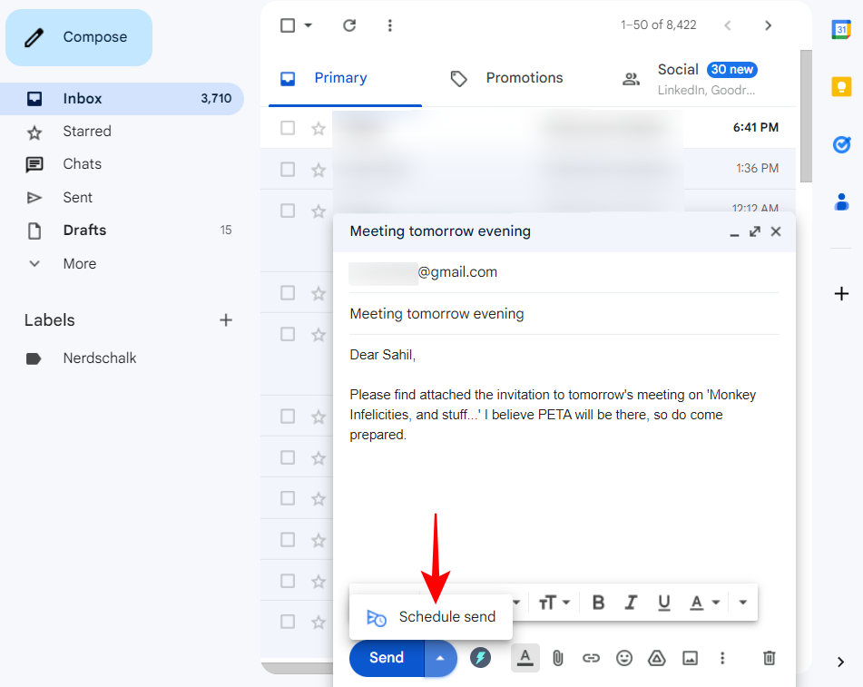 For those looking to edit and reschedule already scheduled emails, skip to the next major section. For everyone else unaware of how to use the schedule function in Gmail, here’s how to go about it: