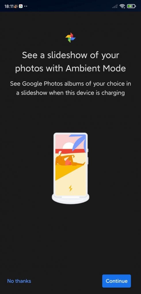 - In the next setup screen, the page will ask you if you want to “see a slideshow of your photos with Ambient Mode”. Click on ‘Continue‘, if you want it, otherwise tap on “No, thanks”.