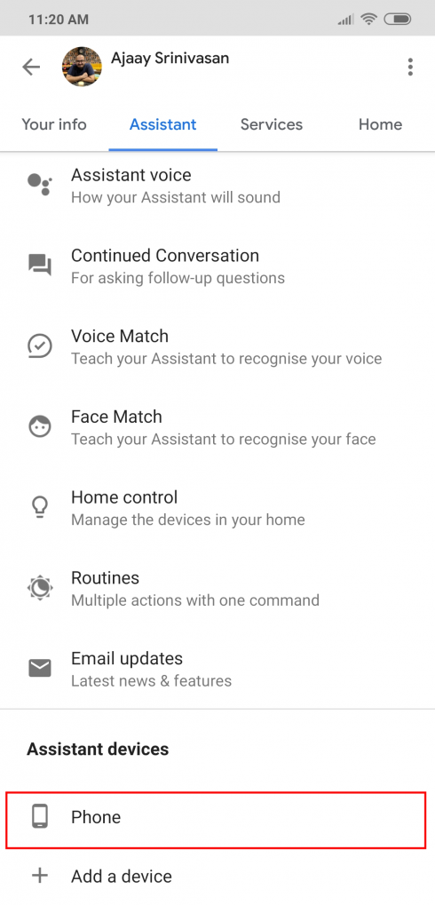 - Under the ‘Assistant devices‘ sub-category, Click on Phone.