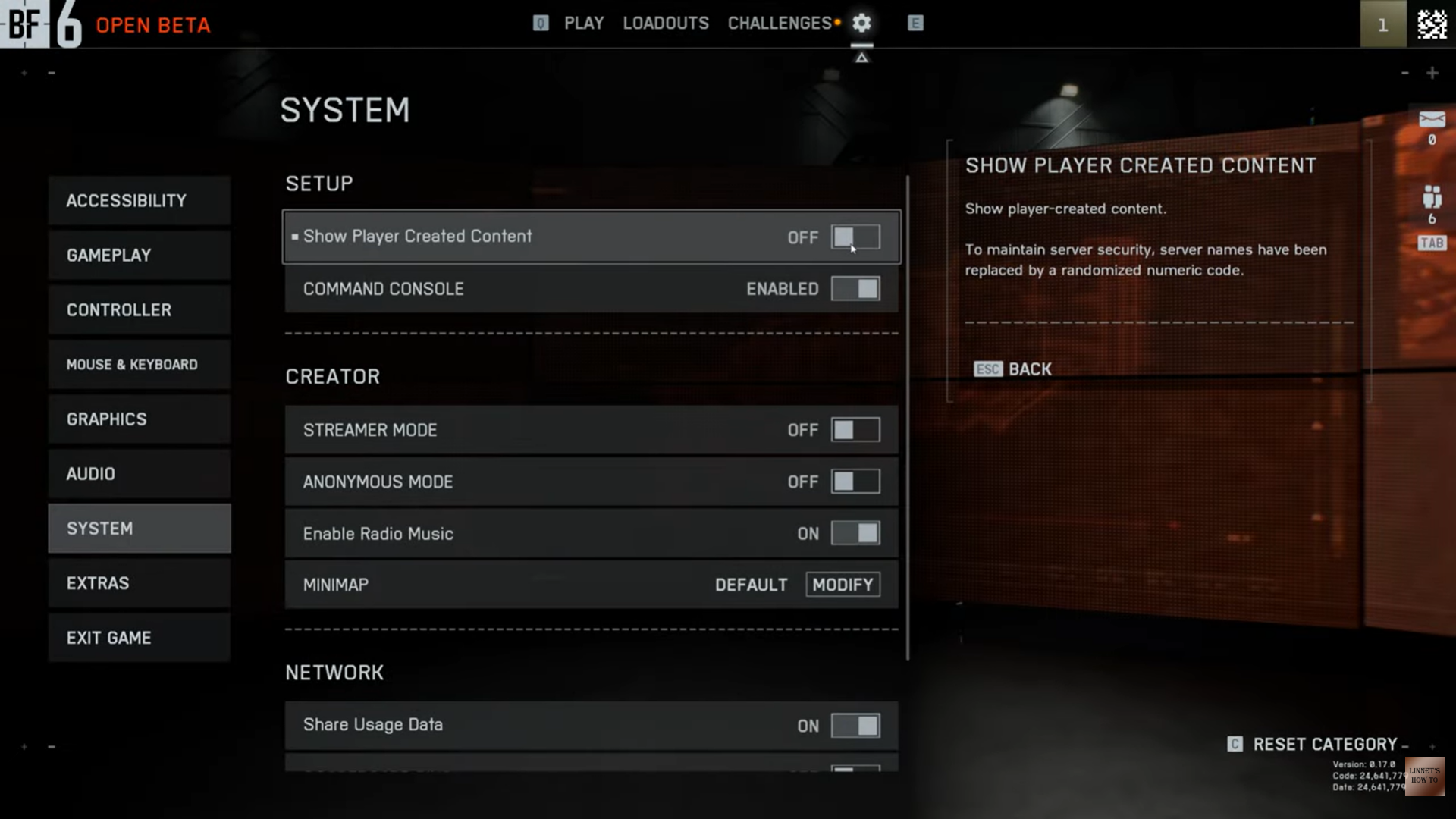 In the settings menu, go to the "System" tab. Scroll down to find the "Show player created content" option.
