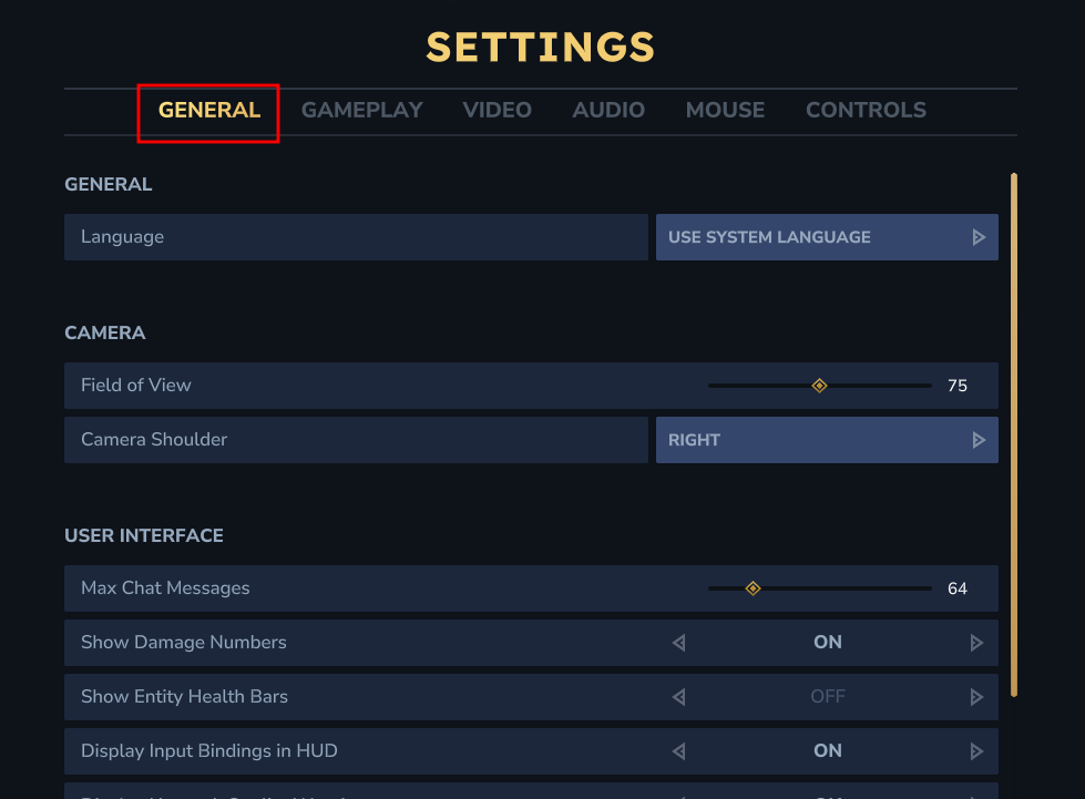 Navigate to the “General” tab. This section contains a variety of general settings for the game, including development options.
