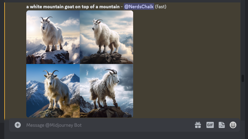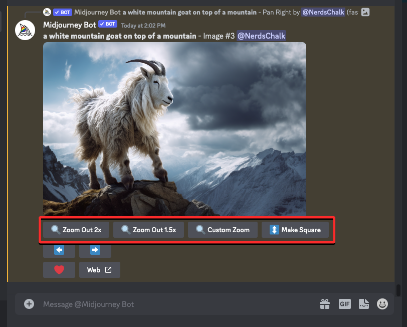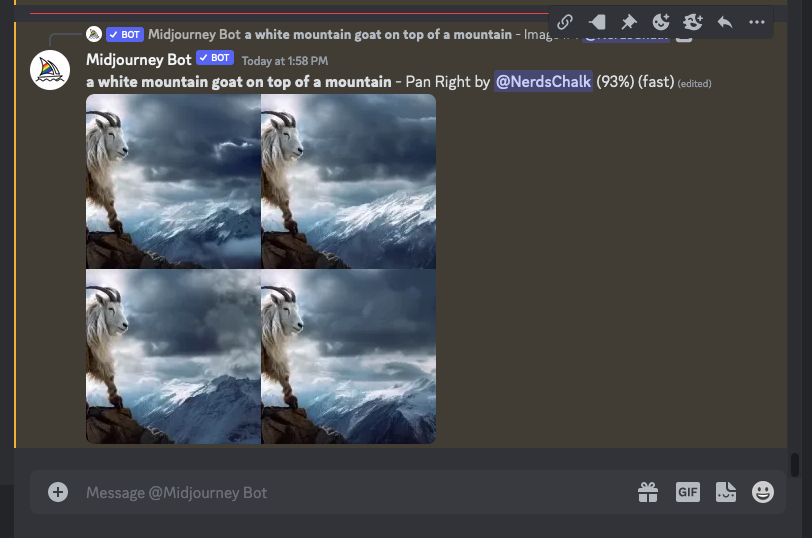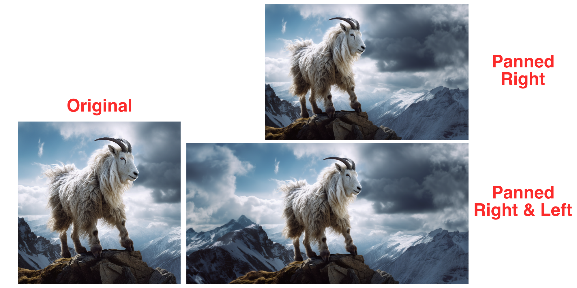 Example 1: Here’s what we created using Pan on Midjourney (horizontally) with the input prompt: a white mountain goat on top of a mountain.