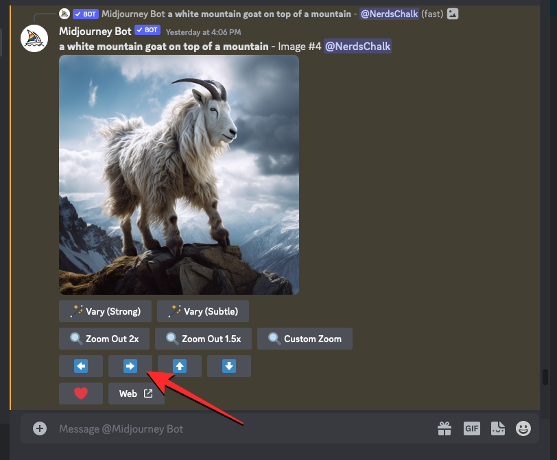 Depending on which side you want to extend on the original image, click on the corresponding arrow icon underneath the upscaled image on Midjourney.