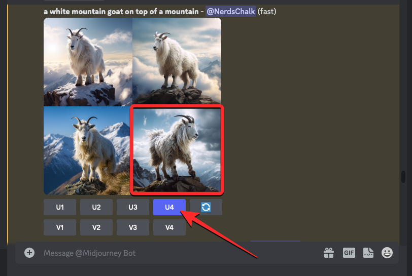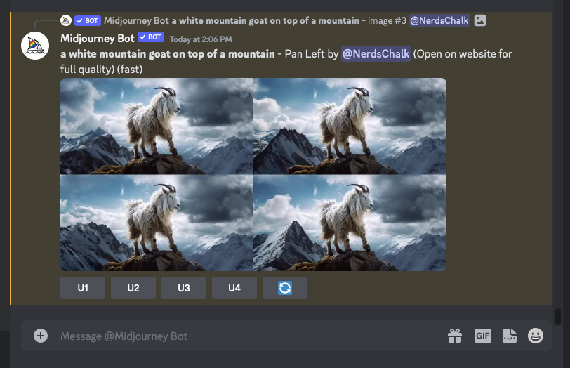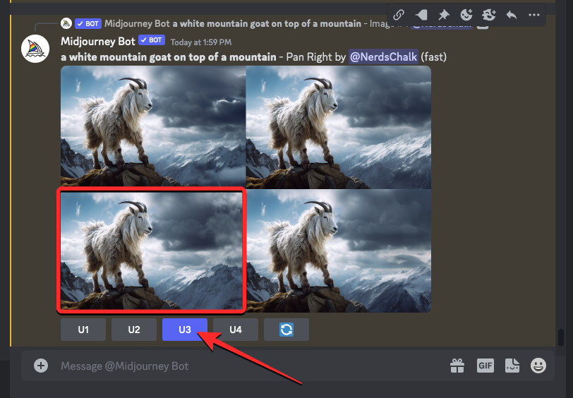 Before you can pan an image in a specific direction, you’ll need to upscale the preferred image from the generated results. To upscale an image, click on any of the options from U1 to U4 that corresponds to the image that you want to further work on.