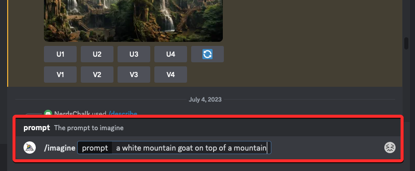 In case you haven’t already generated an image you want to extend from, open any one of Midjourney’s channels on Discord or access the Midjourney Bot on your Discord server or DM. Regardless of how you access Midjourney, you can start generating an image by clicking on the text box at the bottom.