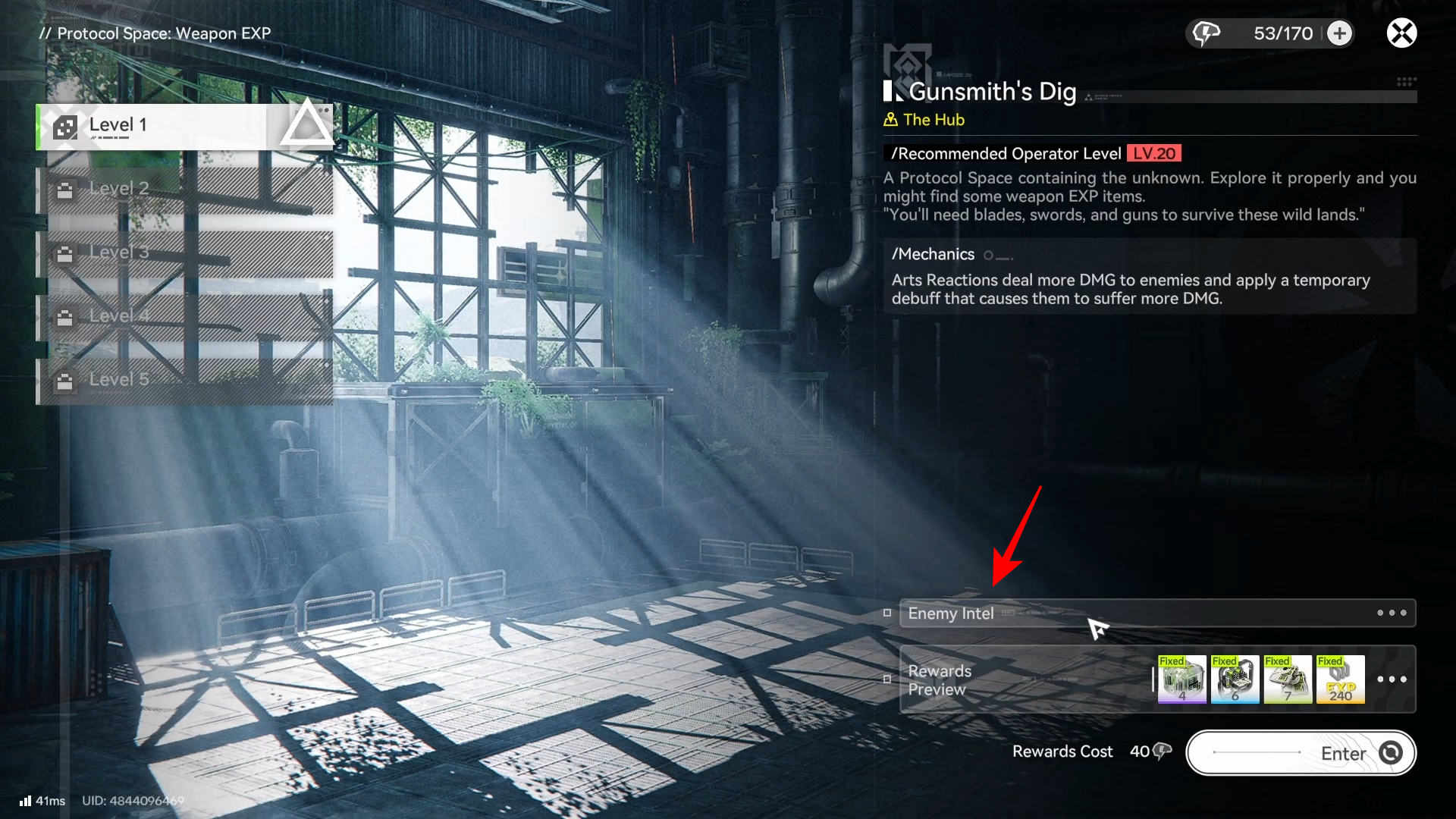 Your best Weapon EXP results come from a tight loop: run the weapon-material Space Protocol tier you can clear quickly, use enemy intel to avoid bad fights, then immediately convert the drops into levels through your weapon upgrade menu.
