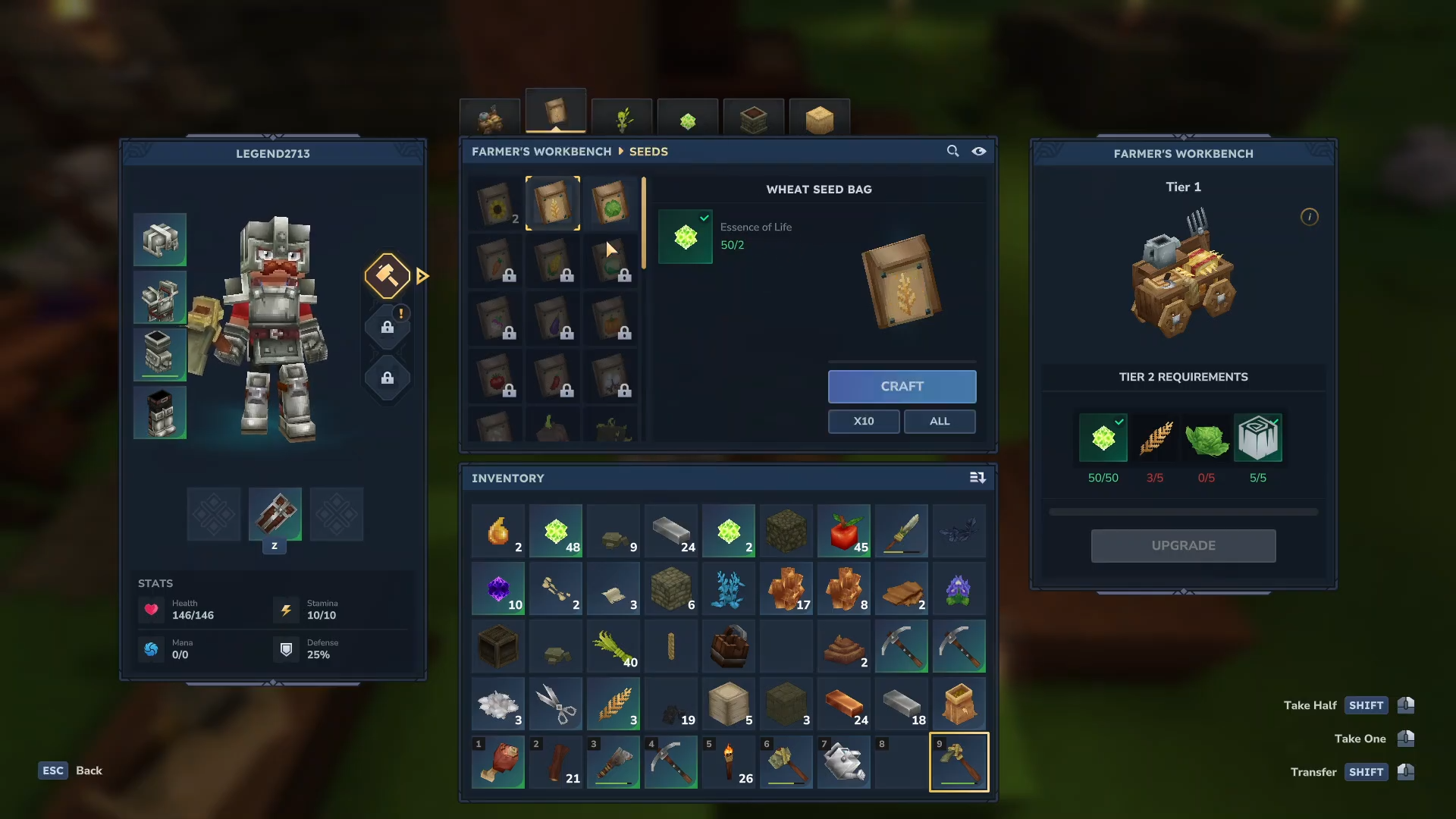 - You must build a standard Workbench (4 trunks, 3 stones) and then a Farmer's Workbench (6 trunks, 20 plant fiber) to begin.