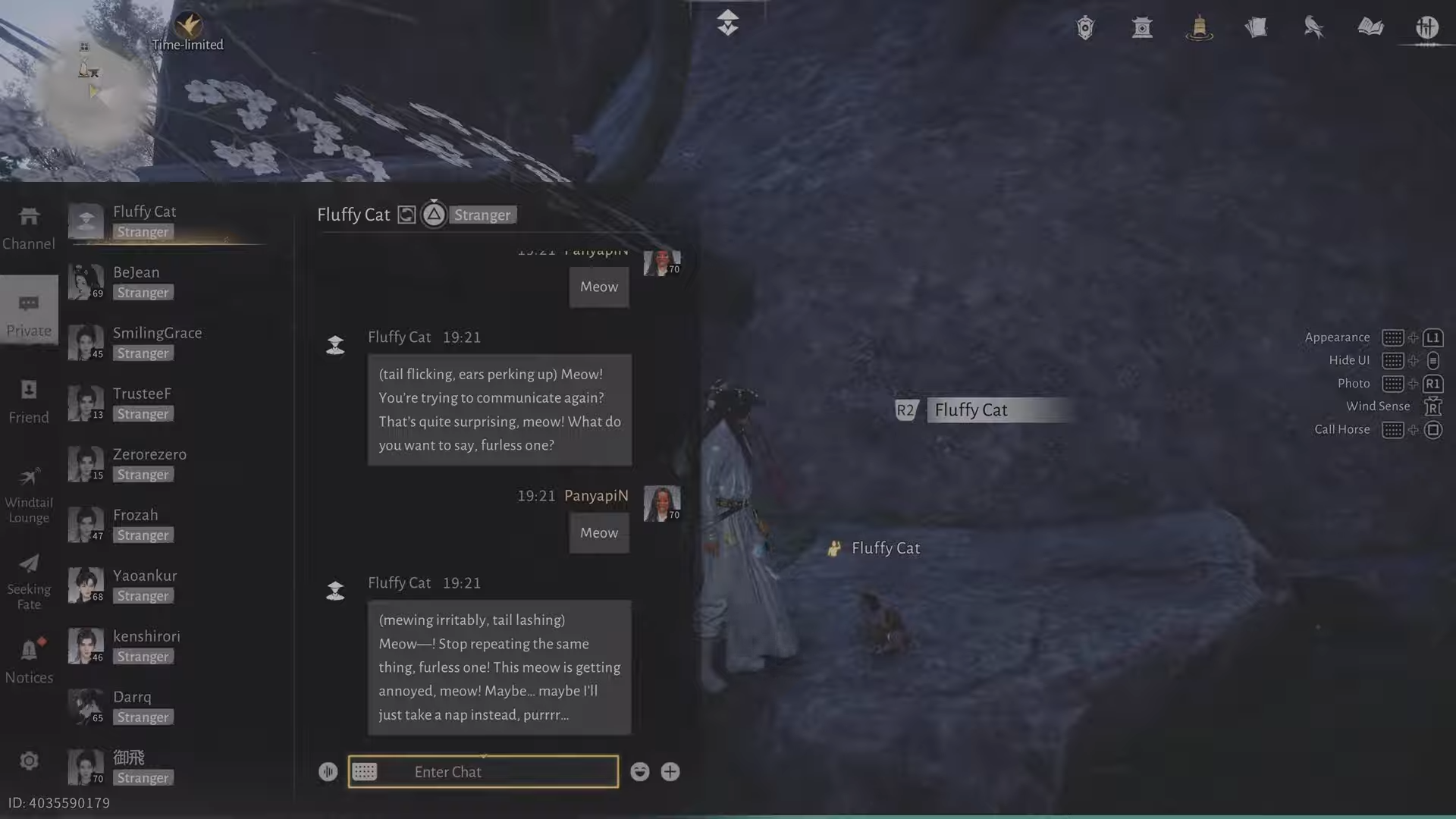 The AI dialogues can vary. It's best to praise Fluffy Cat's "kingly" status and engage playfully. If violent or endless, log out or reset—NPCs respawn. Explore related cats for broader benefits like shop access.