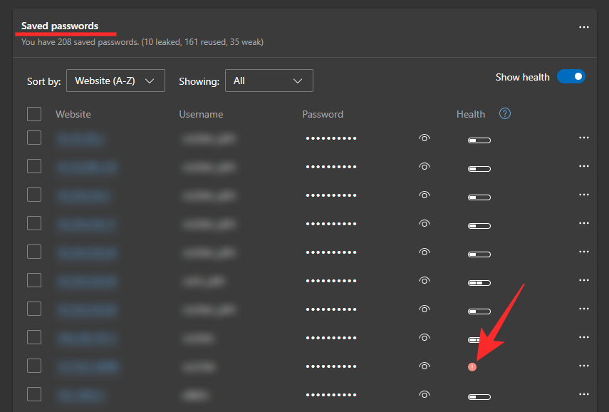Finally, scroll down until you see the ‘Saved passwords’ section. Here, you’ll see all the passwords you have saved in Microsoft Edge so far. Now, look closely, and check if any password has a red exclamation mark on the right of it.