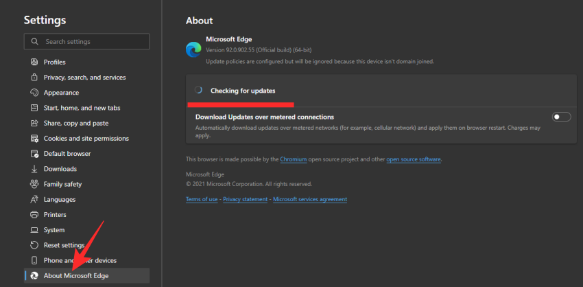 Now, click on ‘About Microsoft Edge’ on the left. Edge would look for an update and start installing it right away.