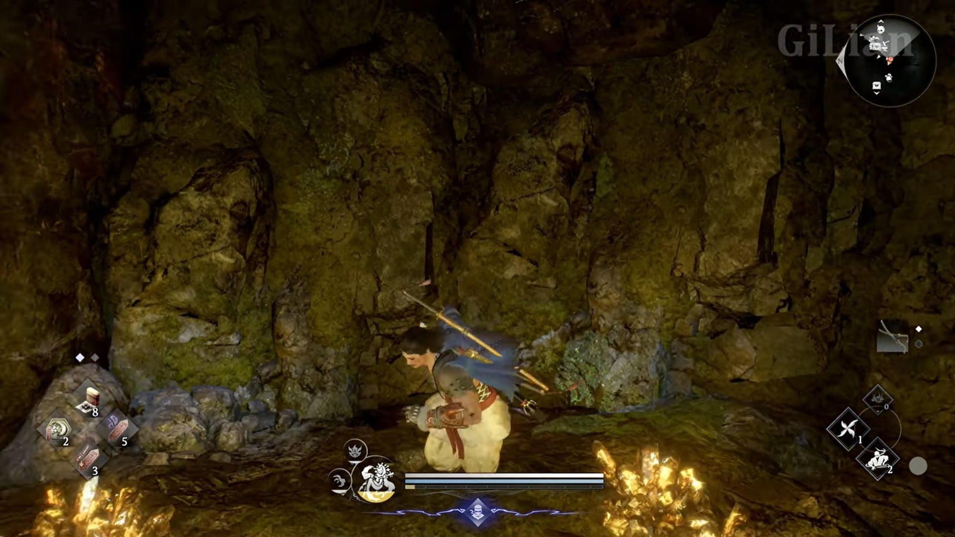 After the drop, continue navigating downward until you reach the lowest cavern level. This area is dimly lit, filled with barrels, crystals, and environmental clutter.