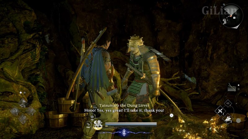 Interacting with Tatsumaro is straightforward but unusual. He asks for Dung Balls, an item many players overlook or discard earlier in the game.