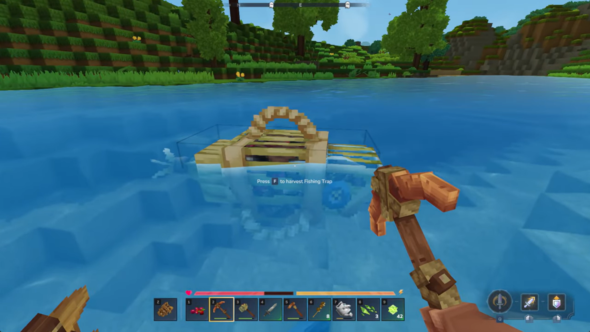 Fishing is handled entirely through placeable fishing traps. Once placed in suitable water, these traps generate fish over time. You simply return later to harvest them, making fishing a low-effort but location-dependent activity.