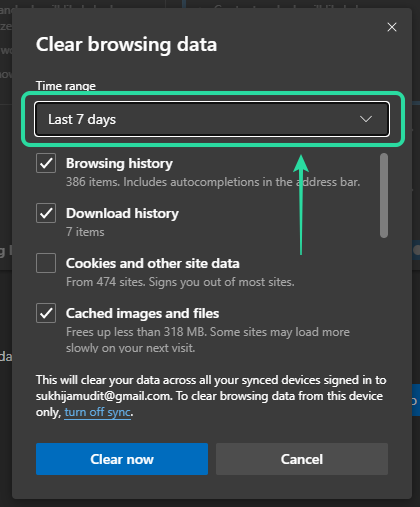 Now choose the time range for which you would like to clear your data. We suggest you start by clearing data for the past week and if that does not work, you can select ‘All-time‘ as your last resort.