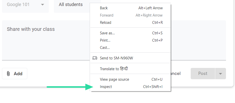 Go to the Classroom where the stream has disappeared and right-click a blank portion of the stream. You should see a drop-down menu appear under your cursor. Click the ‘Inspect’ option.