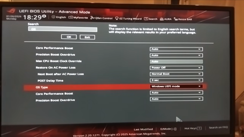 Navigate to the Boot, Security, or Advanced tab depending on your BIOS layout. Find the option labeled OS Type. If your BIOS supports search, typing “OS” can help locate it quickly.