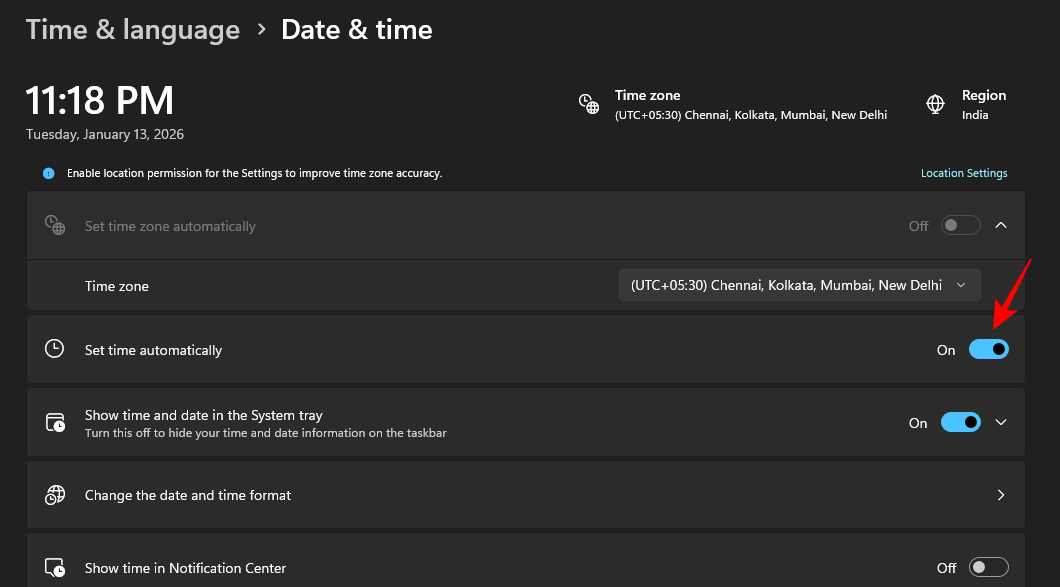 Fix 1: Toggle 'Set time automatically' Off/On on Windows 11