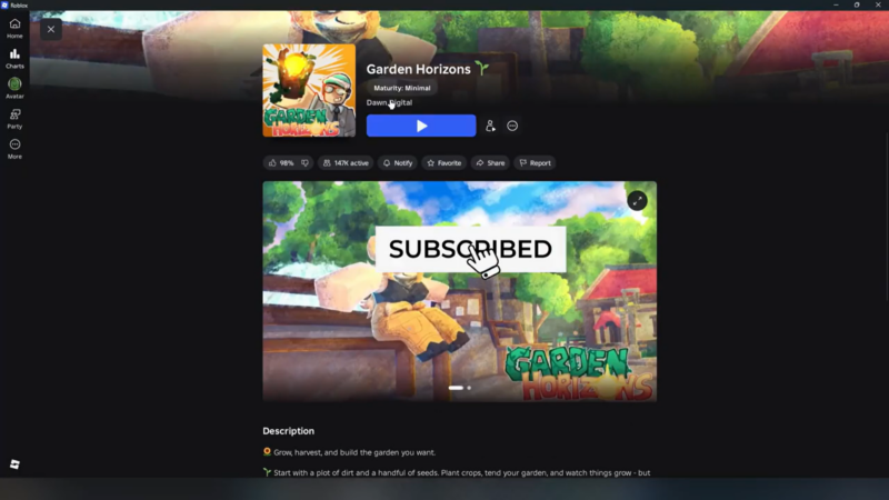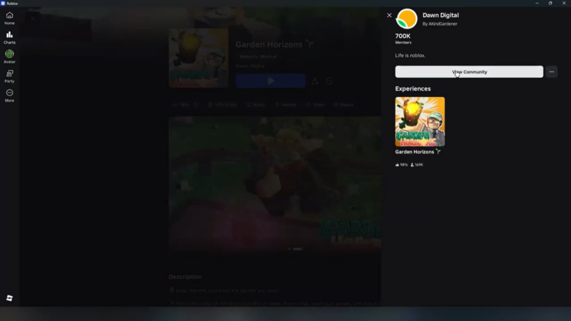 Open Roblox and search for Garden Horizons in the experiences section. Click on the game’s main page instead of immediately pressing Play. Scroll down to find the developer information section.