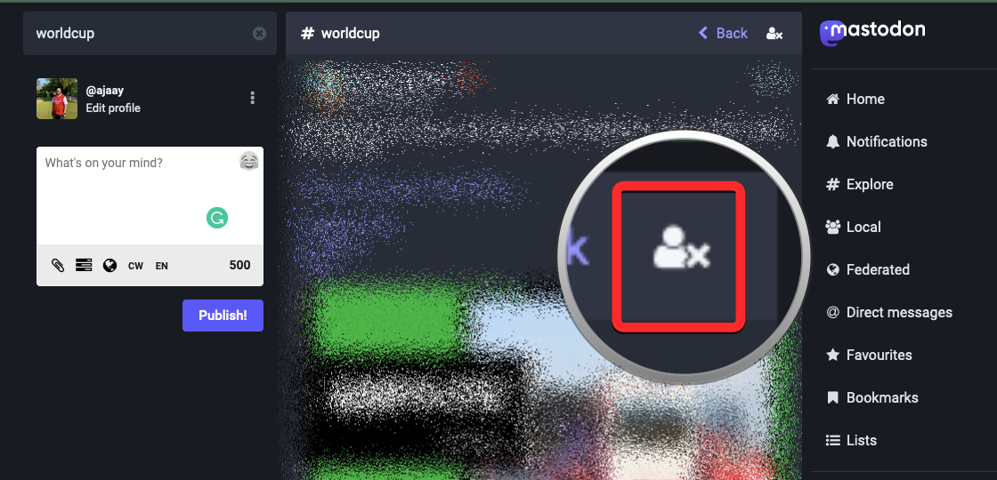 Mastodon will now load all the posts where the selected hashtag was included. To unfollow this hashtag, click on the Unfollow icon that appears on the right-hand side of the hashtag at the top. This icon will be marked with a person and an x sign and will appear right beside the Back option.