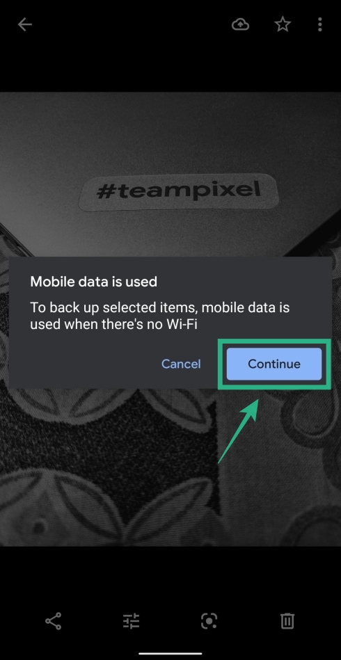 Step 3: When the photo is opened, tap on the cloud icon at the top right to upload it to Google Photos cloud. If you aren’t connected to a WiFi network, the app will prompt you whether you want to use your mobile data to upload the photo. Tap on ‘Continue’ to start uploading the selected picture.