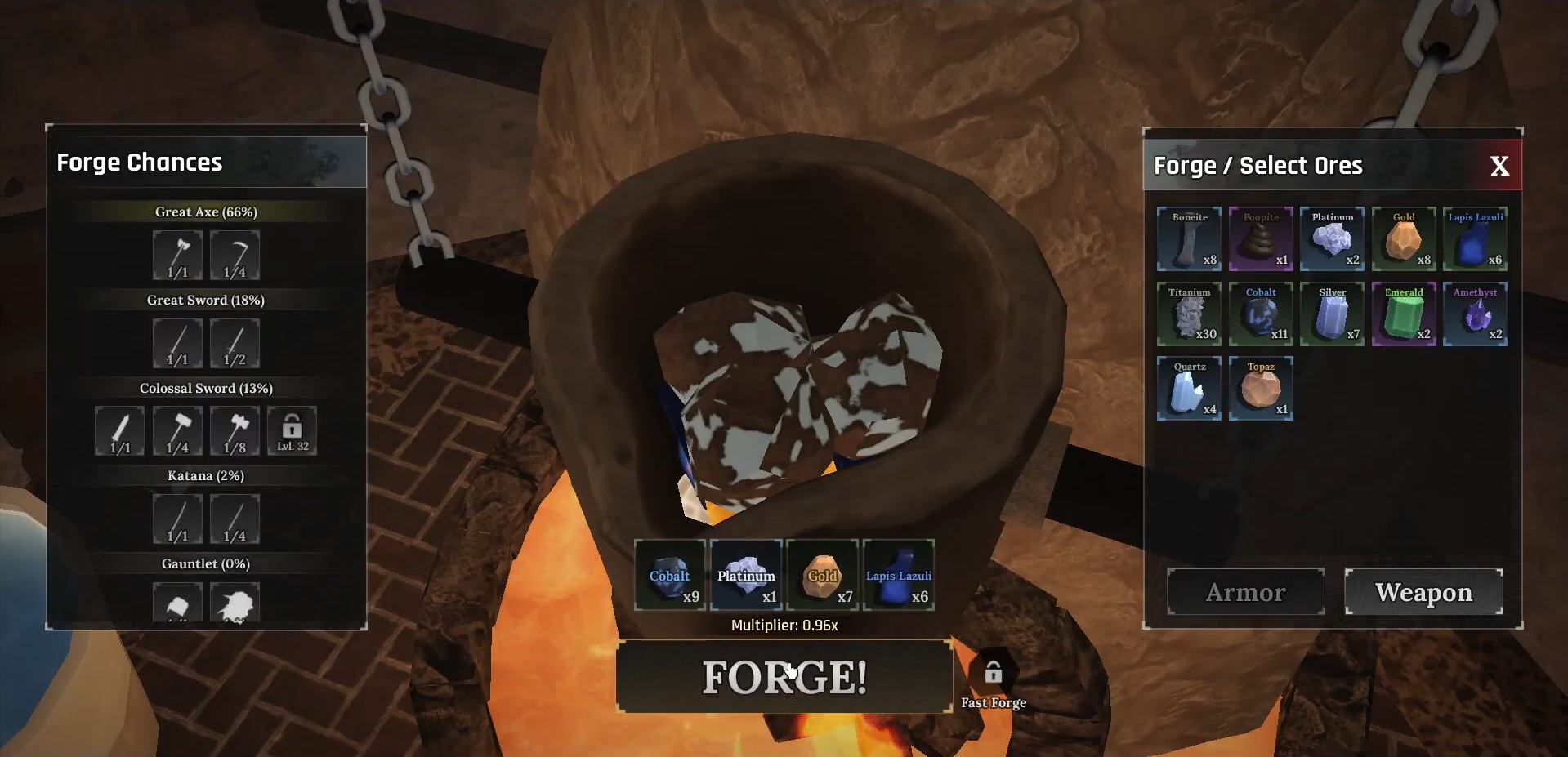 Hammer belongs to the colossal sword class of weapons in the Forge. For its crafting, you must have 26% Lapis Lazuli, 39% Cobalt, 4% Platinum and 30% Gold. You have to use the forging play of the game to craft it.