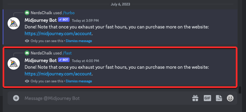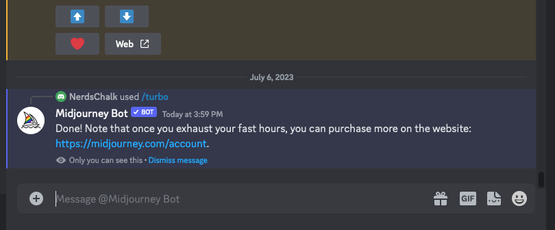 Turbo Mode will now be activated on your Midjourney account and you’ll see a response from the Midjourney Bot as confirmation.