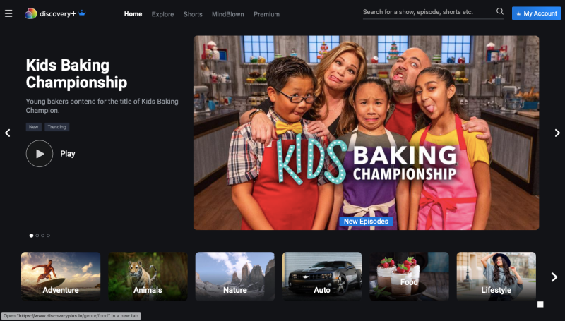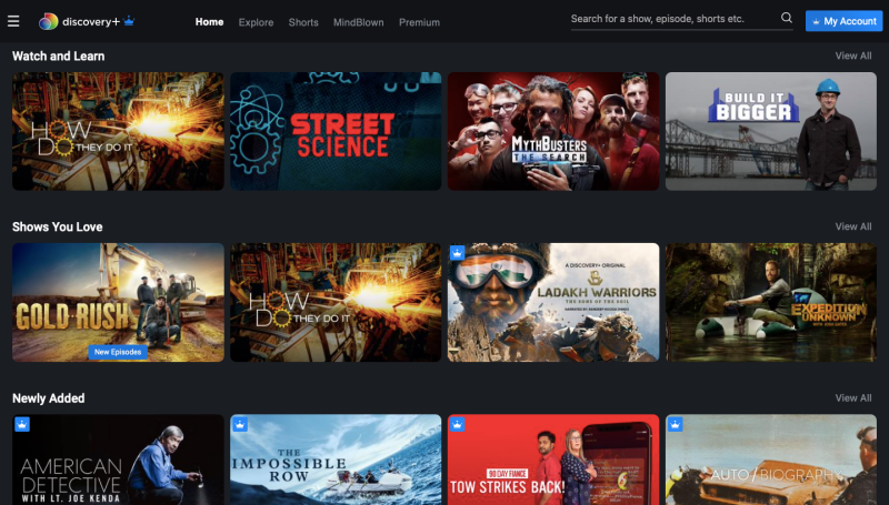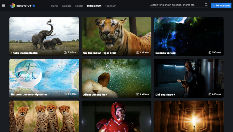 Discovery Plus also provides a bunch of other curated sets of content that you can access by clicking any of the Shorts, MindBlown, and Premium tabs at the top of the Discovery Plus page.