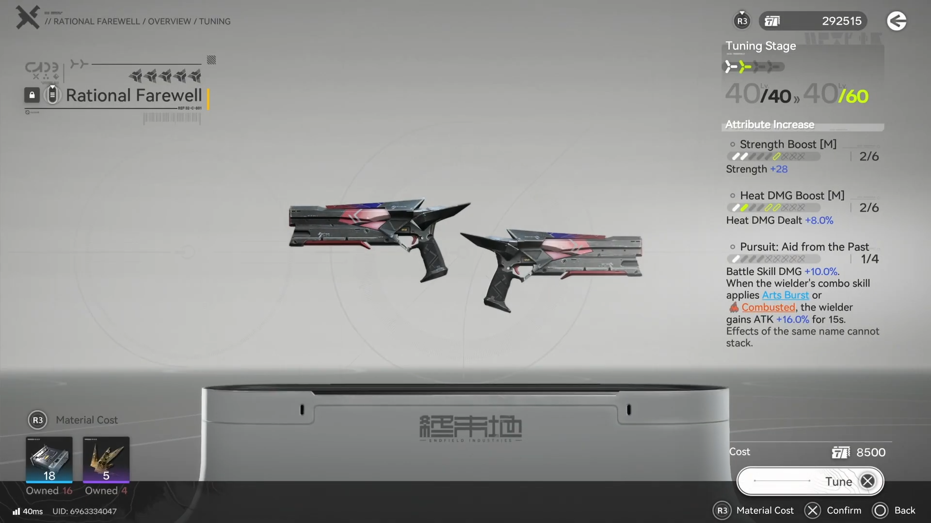 Once enough Cast Die is obtained, applying weapon tuning to raise the weapon’s level cap is what unlocks continued leveling past the level 40 threshold.
