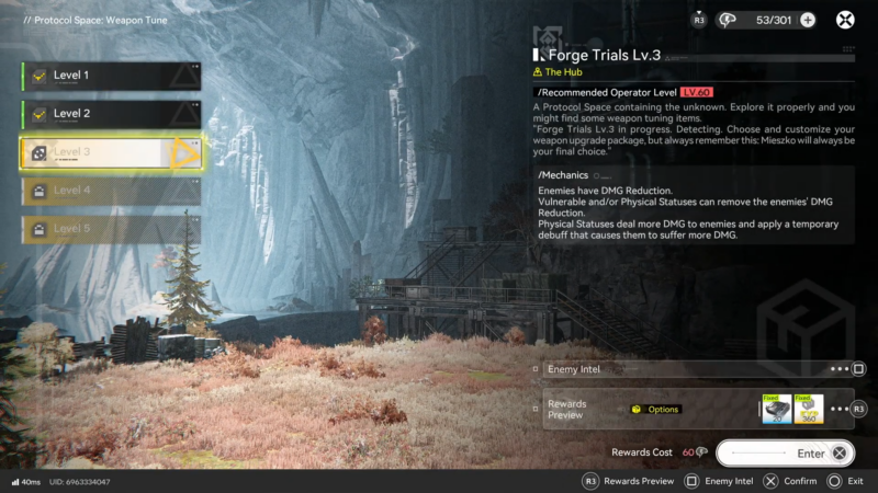 - The main farm method is Protocol Space: Weapon Tune at Threat Level 1 or higher; rewards require Sanity to claim.