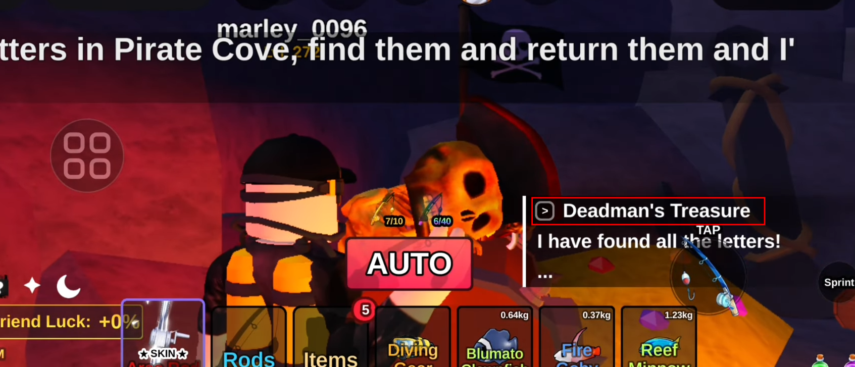Start Dead Man’s Treasure by talking to the quest NPC in the pirate treasure room inside Pirate Cove in Fisch.