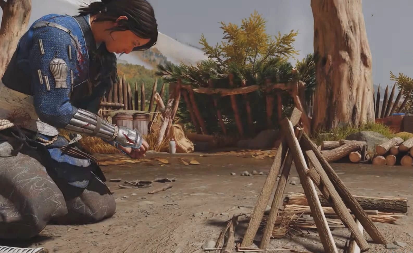 Light the campfire behind you and then climb the ladder to the cliff edge on the south side of the enemy camp when instructed. There’s a specific “hide on the cliff” moment — position yourself in the vegetation or behind the hay stacks as the tale requires.
