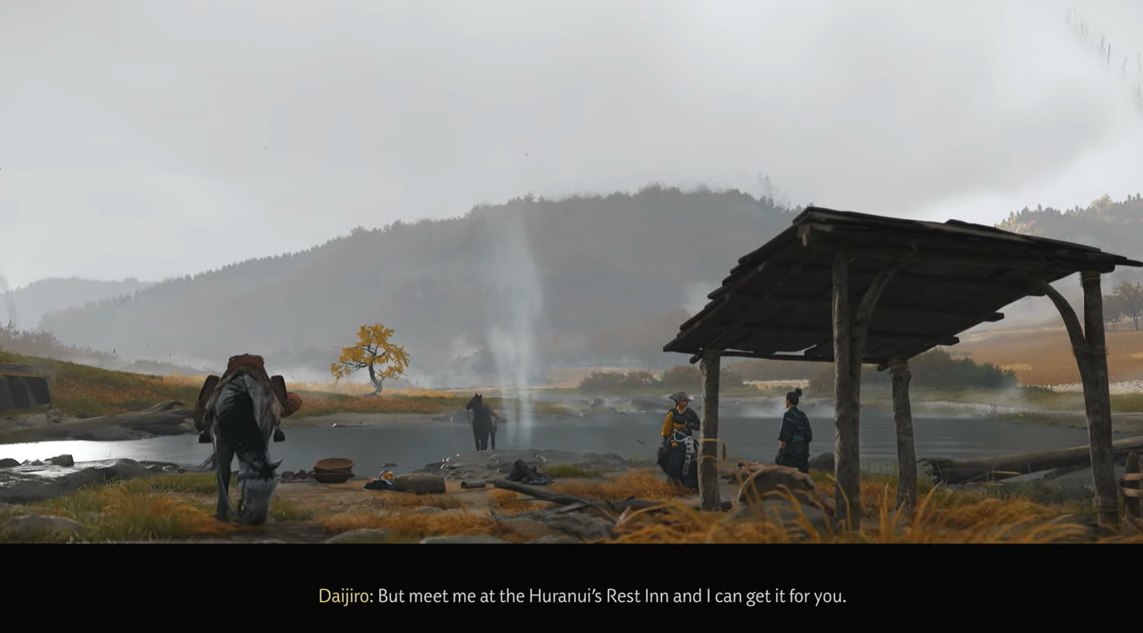 Speak with Daijiro at Huranui’s Rest Inn (or the campfire in Cairn Forks). Accept to follow him — this kicks off the sequence of in-town events.