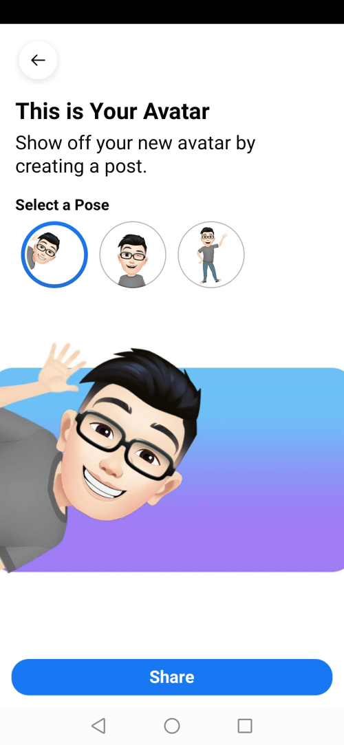 Once you have selected the pose, click the Share button at the bottom. Now, select whom you want to share the Avatar with, add it to an album if you wish to, write a message if you want to, select