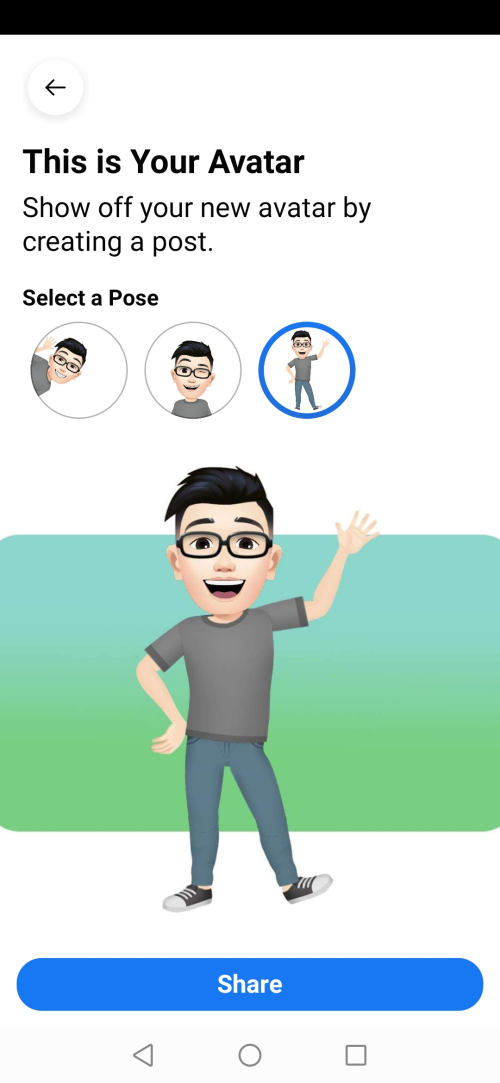Now select the pose for your Avatar as shown in the screenshots below. This is the pose in which your new Avatar will be shared with your friends on Facebook.