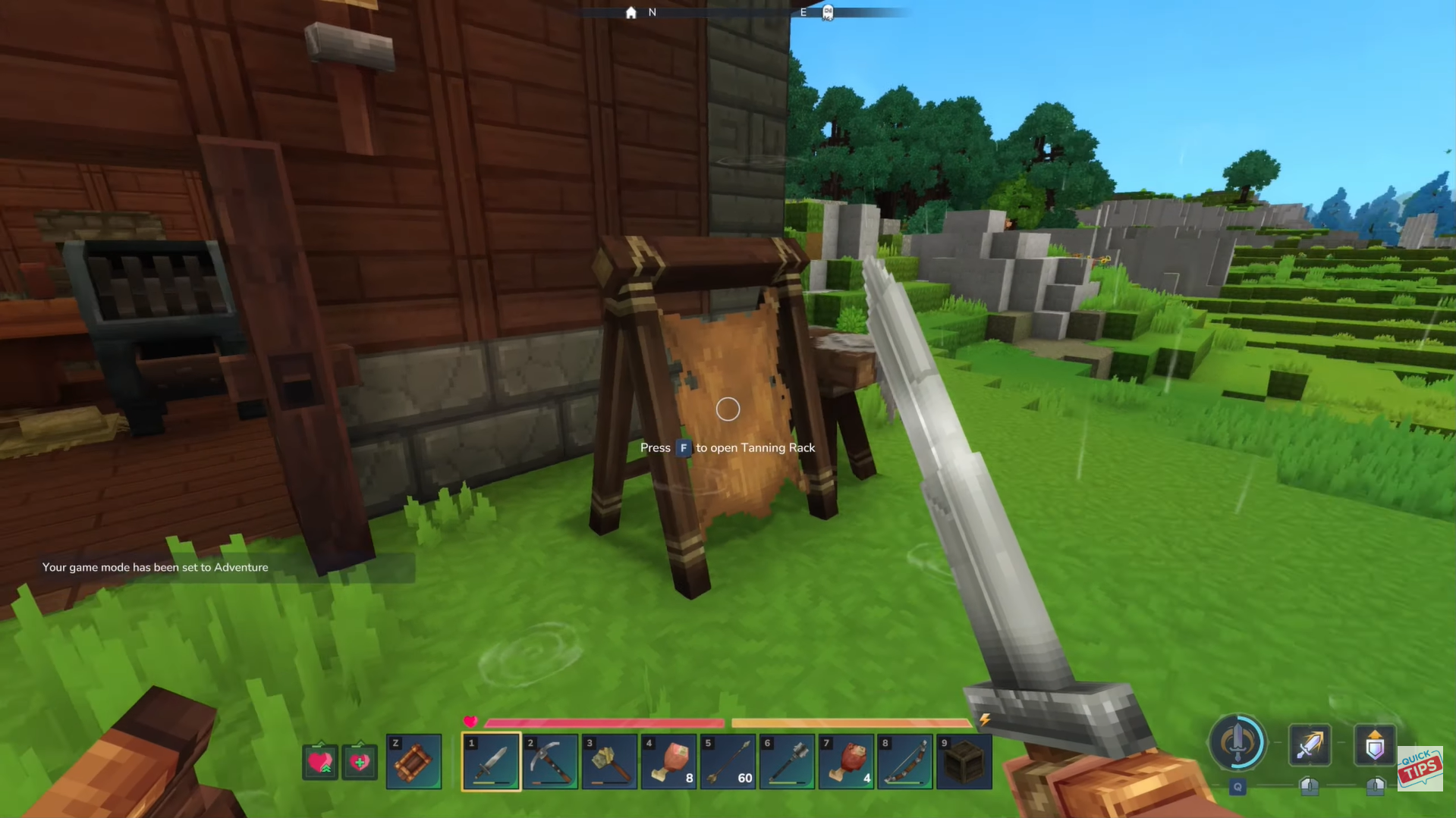 - The tanning rack is placed in the world and used like a crafting station; just put the hides in and wait for the process to finish.