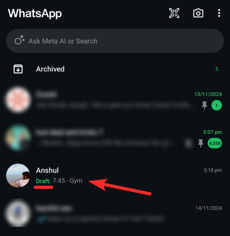 Step 5: The unsent message will now appear as a Draft, and the chat will move to the top of your chat list.