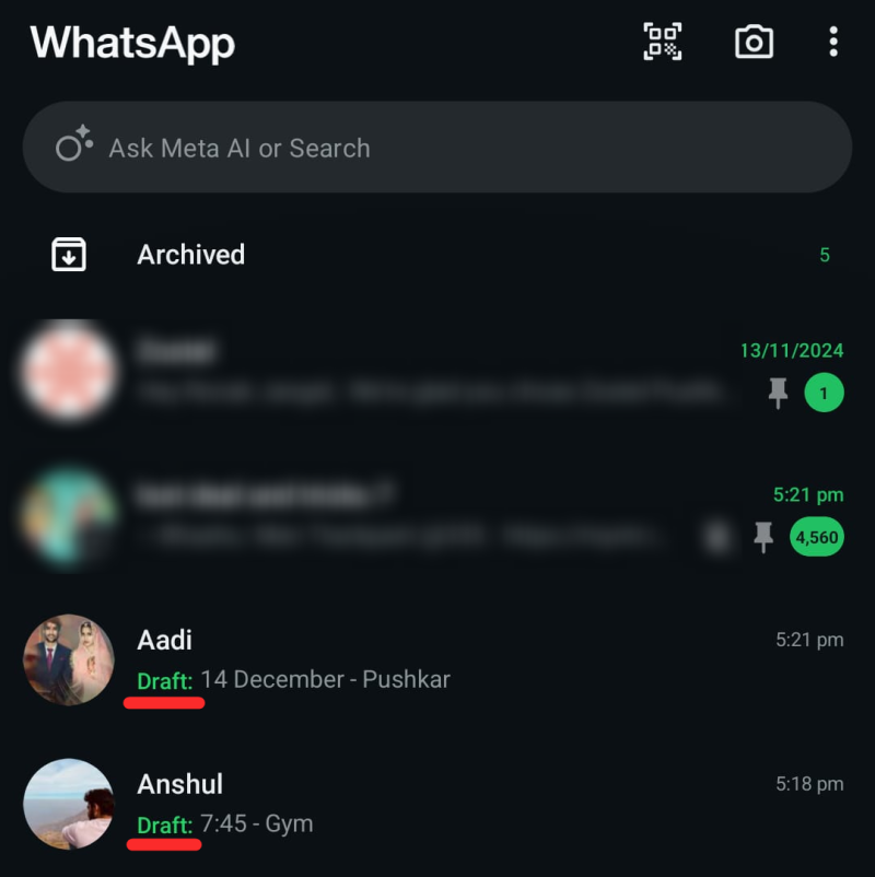 Step 6: You can have multiple chats with drafts, all of which will appear at the top of your chat list.