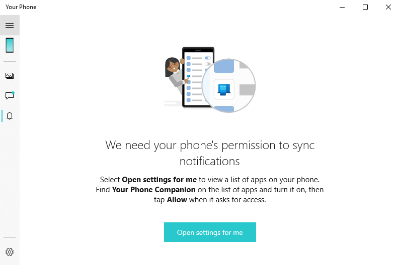 Step 7: Allow the connection between your smartphone and computer. To view your smartphone’s notification on your PC screen, you’ll need to allow the Your Phone companion app to read your notifications. On your Windows 10 PC, click on Open Settings For Me.