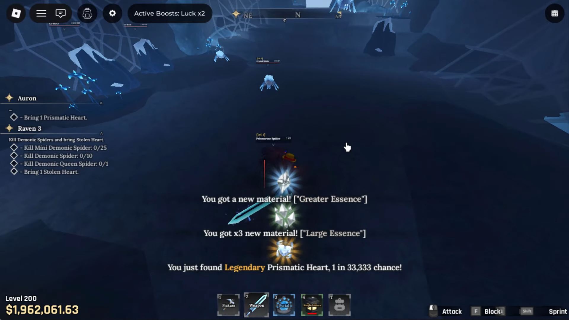 - Prismatic Heart drops from Prismarine Spider boss in Spider Cave, Island 3 (Frostspire Expanse).