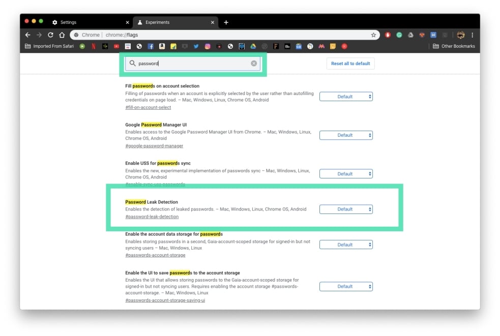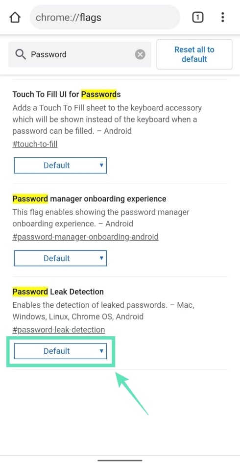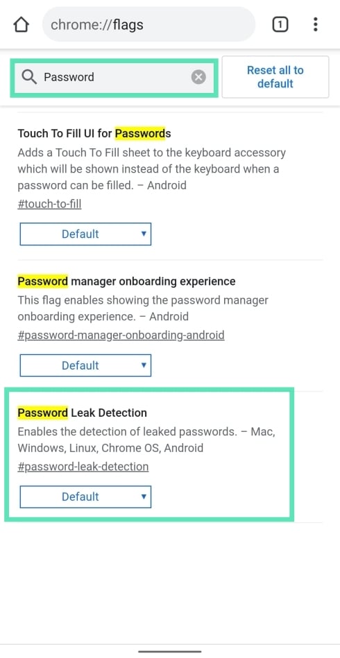 Step 3: At the top of the Chrome flags page, tap on the search box and type ‘password’.