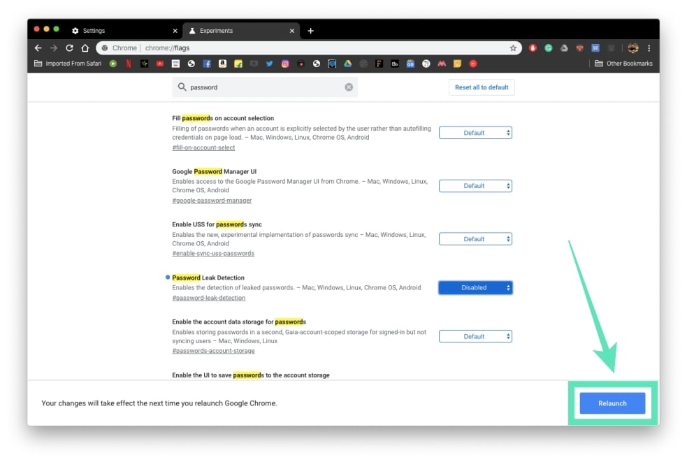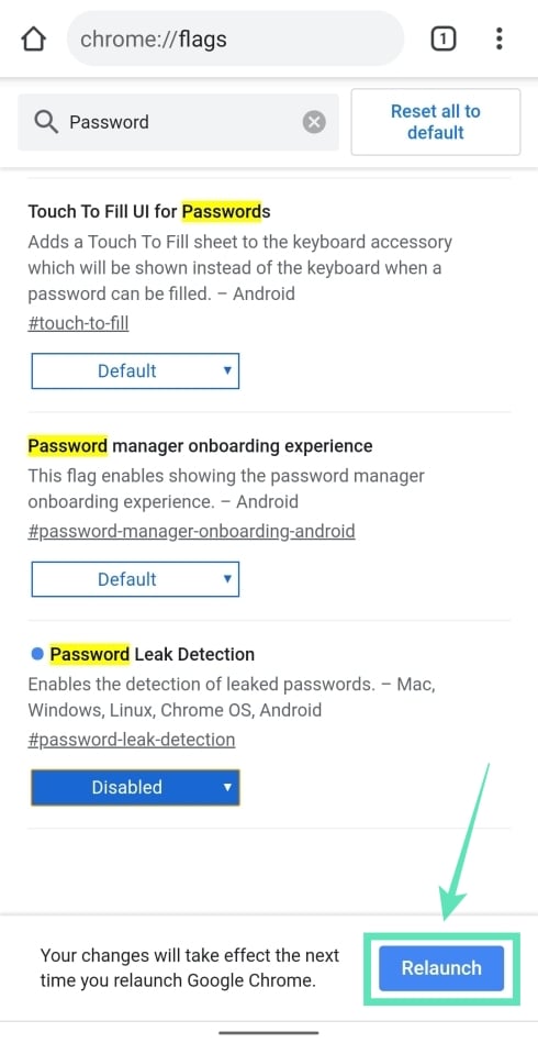 Step 6: After you disable the Password Leak Detection chrome flag, tap on the Relaunch button at the bottom of your screen.