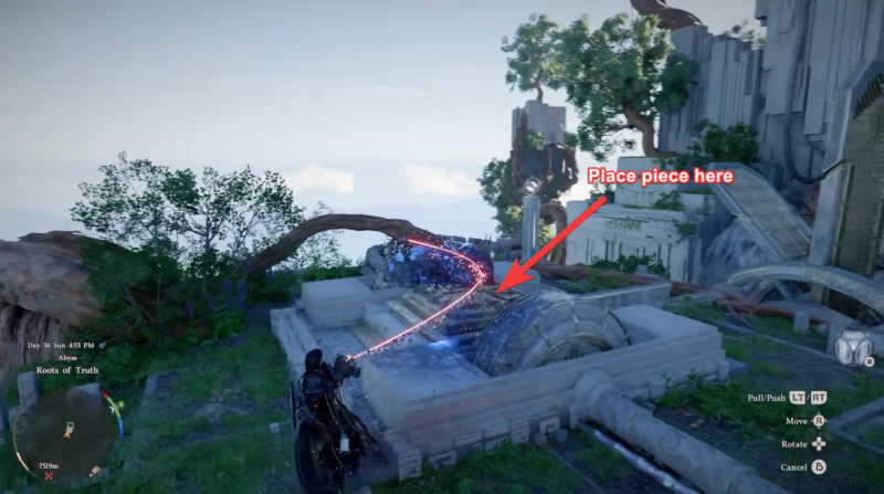 Once on the 2nd building, look for the floating Axiom piece on the interior. Use Axiom pull to bring the piece toward the mechanism. Be mindful of obstacles that may block its path.