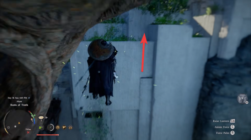 Once the mechanism activates, locate the large branch structure above. Begin climbing using ledges and natural grips along the branch. Maintain stamina and avoid rushing upward, as falling can reset progress.