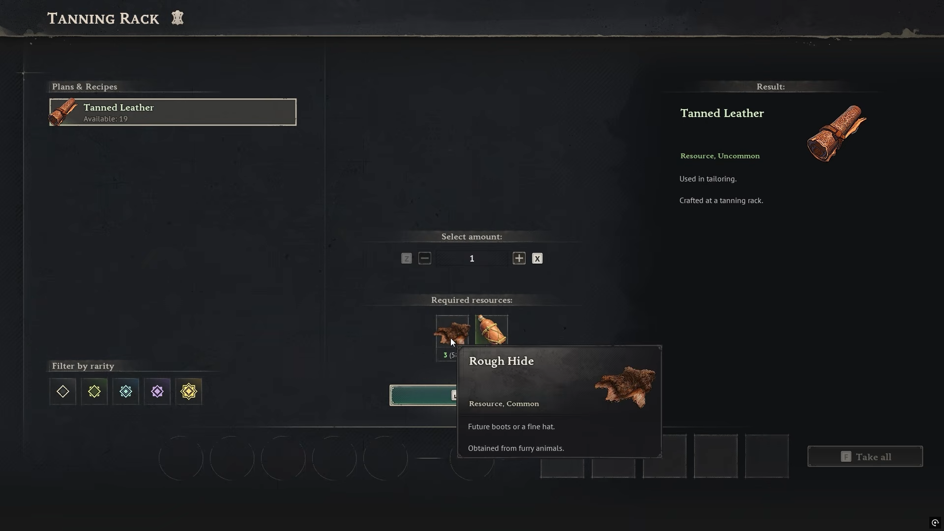 Rough Hide is the base hide you need before tanning can begin, so treat it as your first farming target. The exact source depends on what you are currently able to hunt, but the important part is to build up enough hide before heading back to the crafting station.